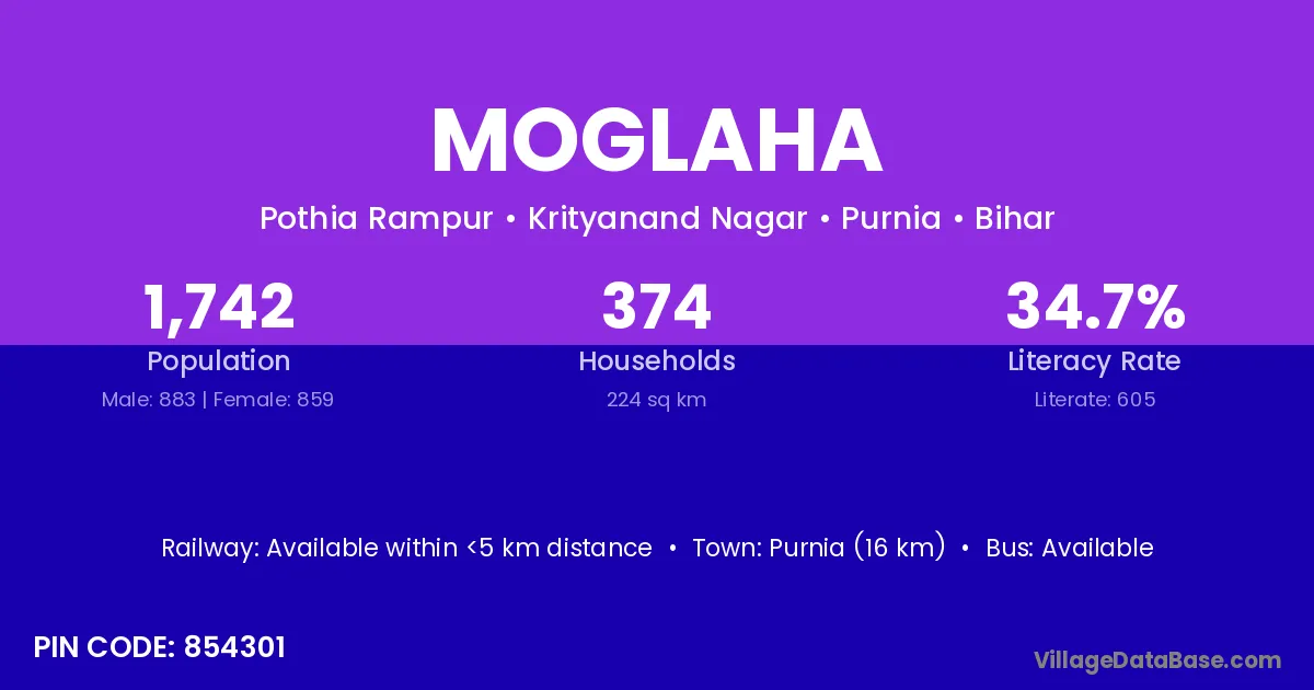 Purnia (16 km) is the nearest town to Moglaha village for major economic activities and is located approximately 16 km away.