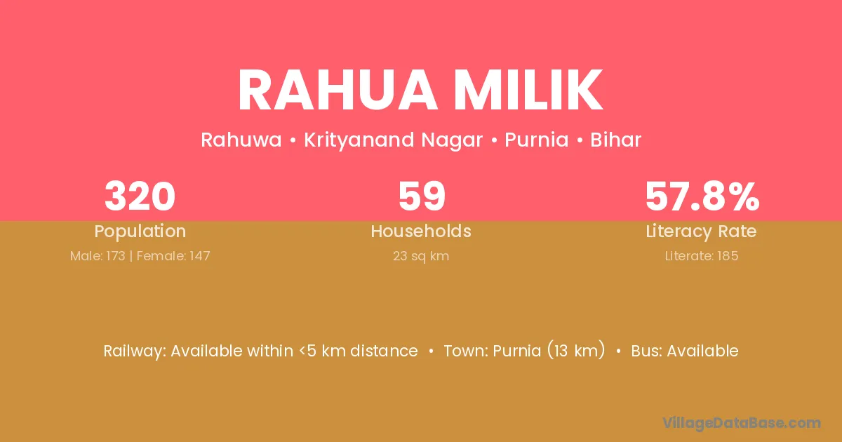 Purnia (13 km) is the nearest town to Rahua Milik village for major economic activities and is located approximately 13 km away.