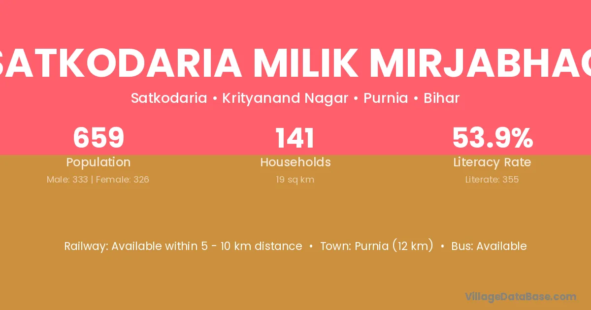 Purnia (12 km) is the nearest town to Satkodaria Milik Mirjabhag village for major economic activities and is located approximately 12 km away.