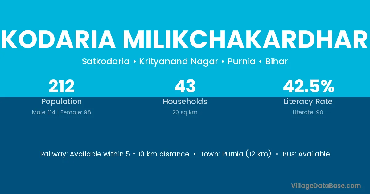 Purnia (12 km) is the nearest town to Satkodaria Milikchakardharilal village for major economic activities and is located approximately 12 km away.
