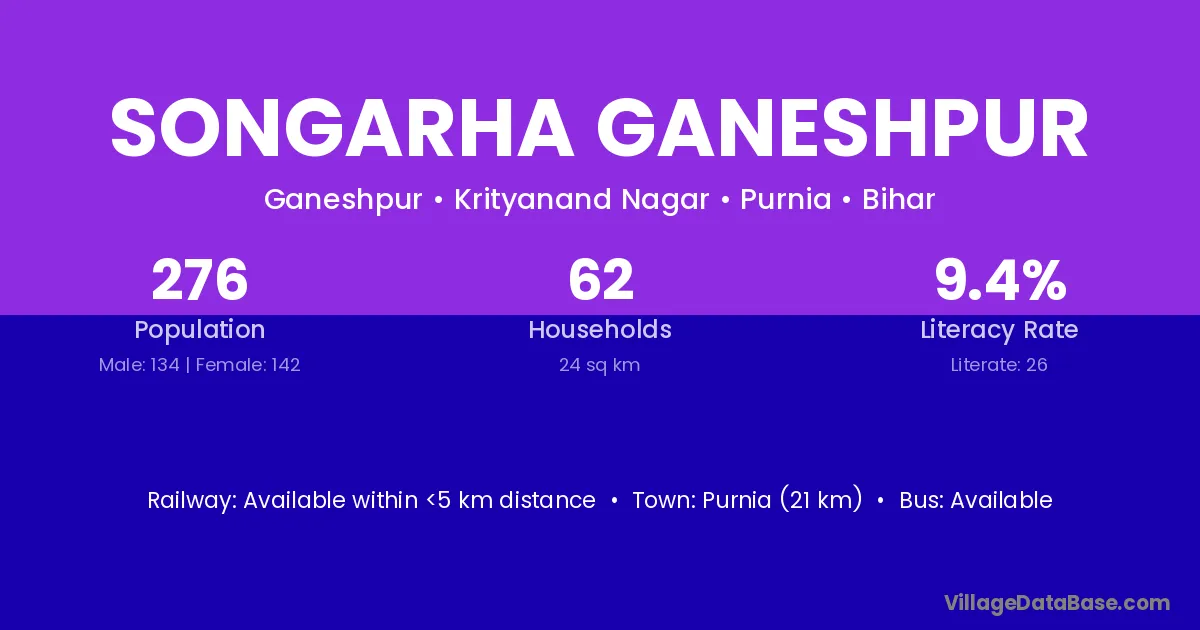 Purnia (21 km) is the nearest town to Songarha Ganeshpur village for major economic activities and is located approximately 21 km away.