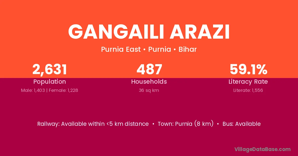 Purnia (8 km) is the nearest town to Gangaili Arazi village for major economic activities and is located approximately 8 km away.