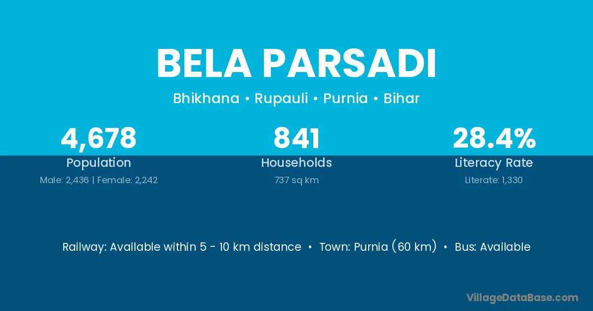 Purnia (60 km) is the nearest town to Bela Parsadi village for major economic activities and is located approximately 60 km away.