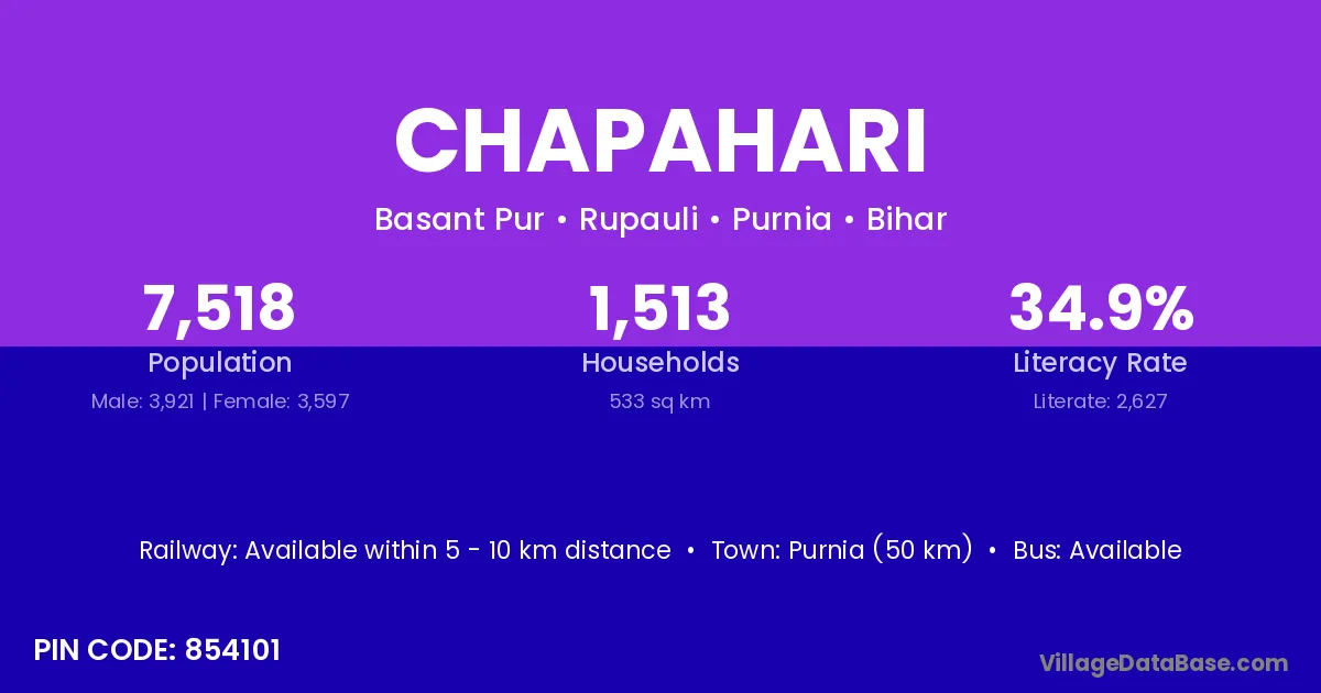 Purnia (50 km) is the nearest town to Chapahari village for major economic activities and is located approximately 50 km away.
