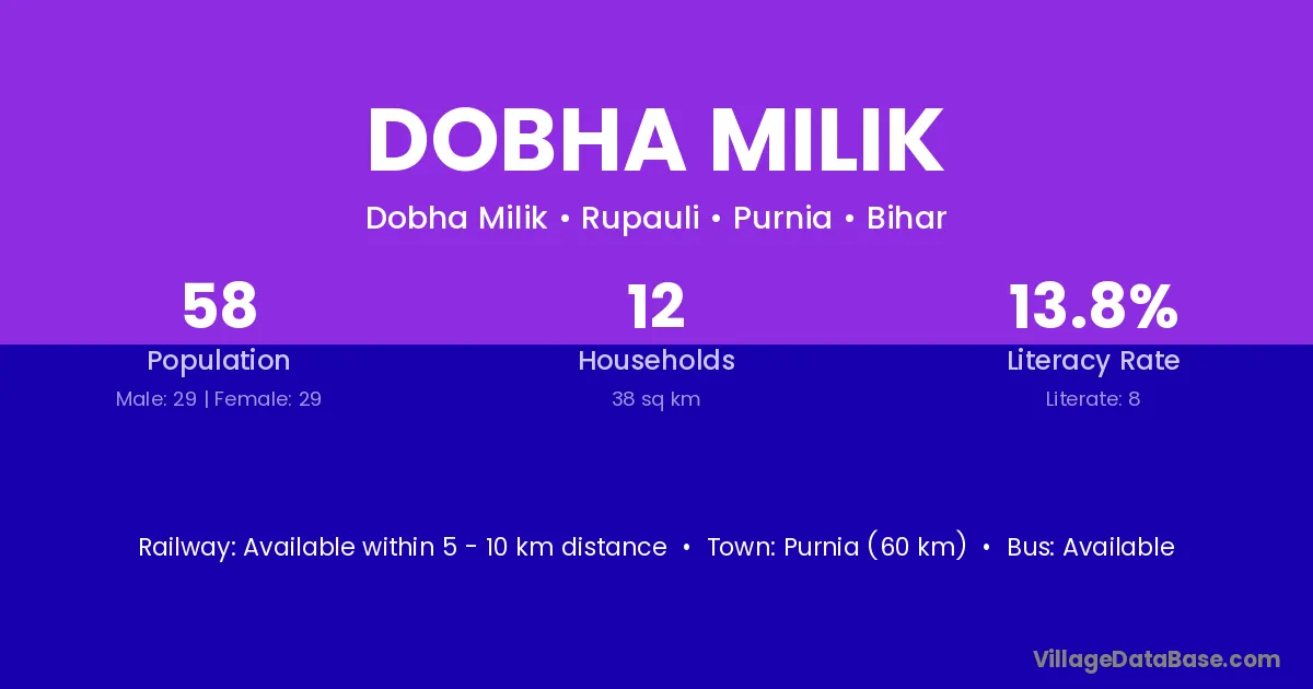 Purnia (60 km) is the nearest town to Dobha Milik village for major economic activities and is located approximately 60 km away.