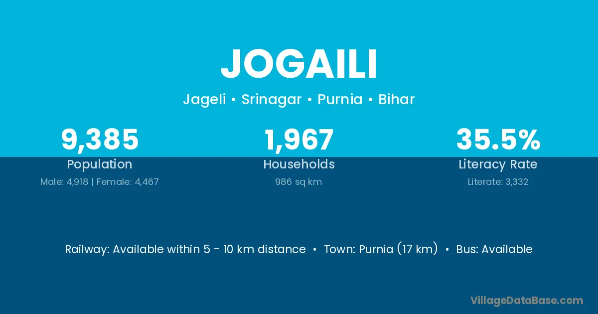 Purnia (17 km) is the nearest town to Jogaili village for major economic activities and is located approximately 17 km away.