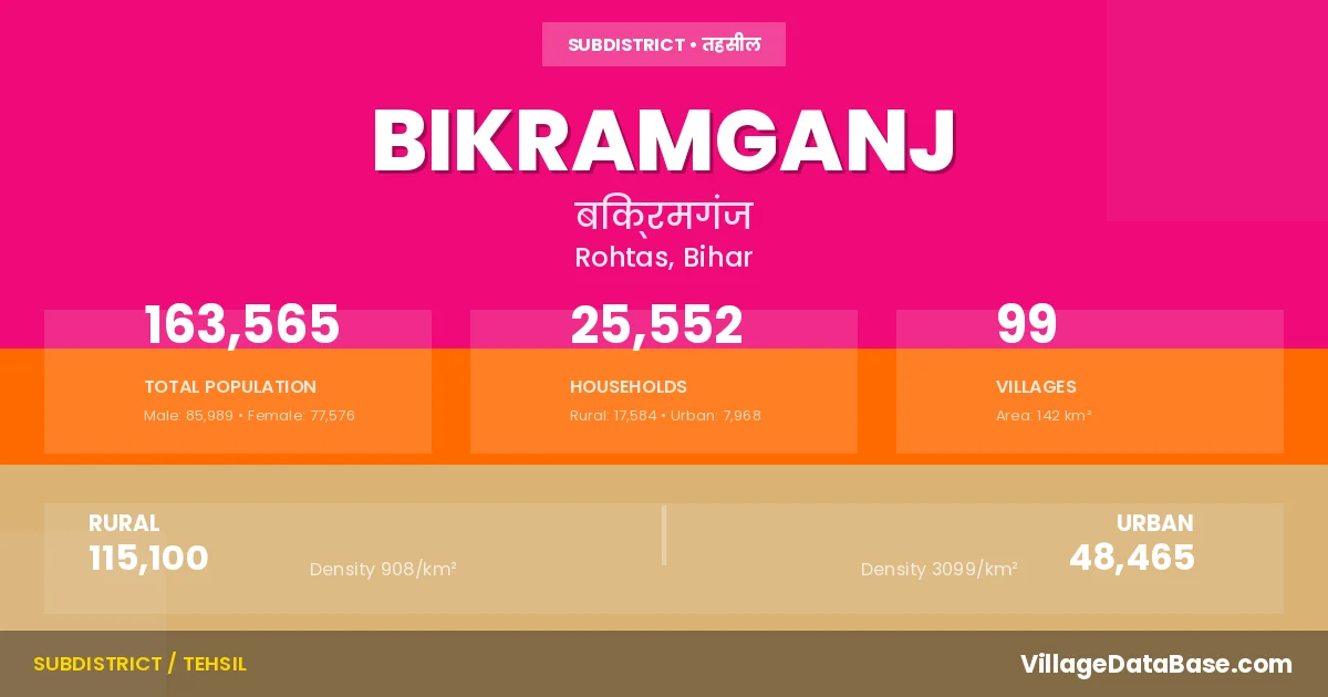 According to the 2011 census The total area of Bikramganj Subdivision is 142 km², with a population of 163565 people. The population density is 1,149 inhabitants per square kilometre, and there are approximately 25552 houses in the sub district.