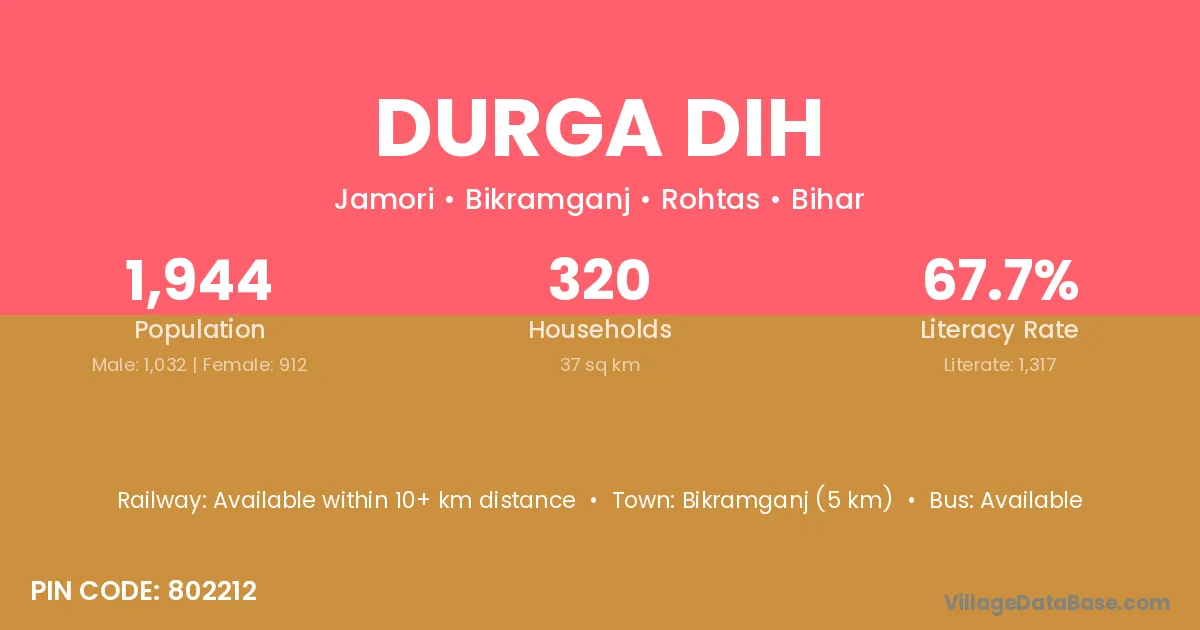 Bikramganj (5 km) is the nearest town to Durga Dih village for major economic activities and is located approximately 5 km away.