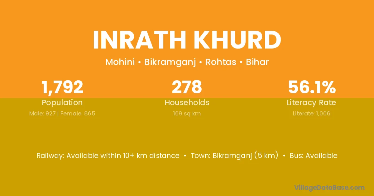 Bikramganj (5 km) is the nearest town to Inrath Khurd village for major economic activities and is located approximately 5 km away.