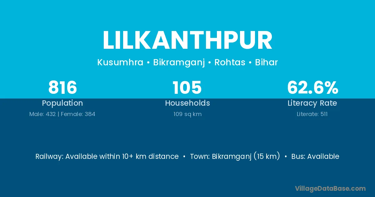 Bikramganj (15 km) is the nearest town to Lilkanthpur village for major economic activities and is located approximately 15 km away.