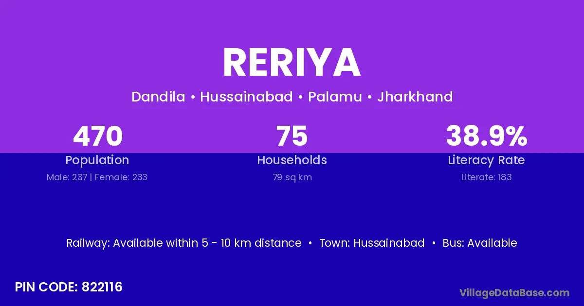 Reriya village has a total population of 2,004 people, of which 1,048 are males and 956 are females.
