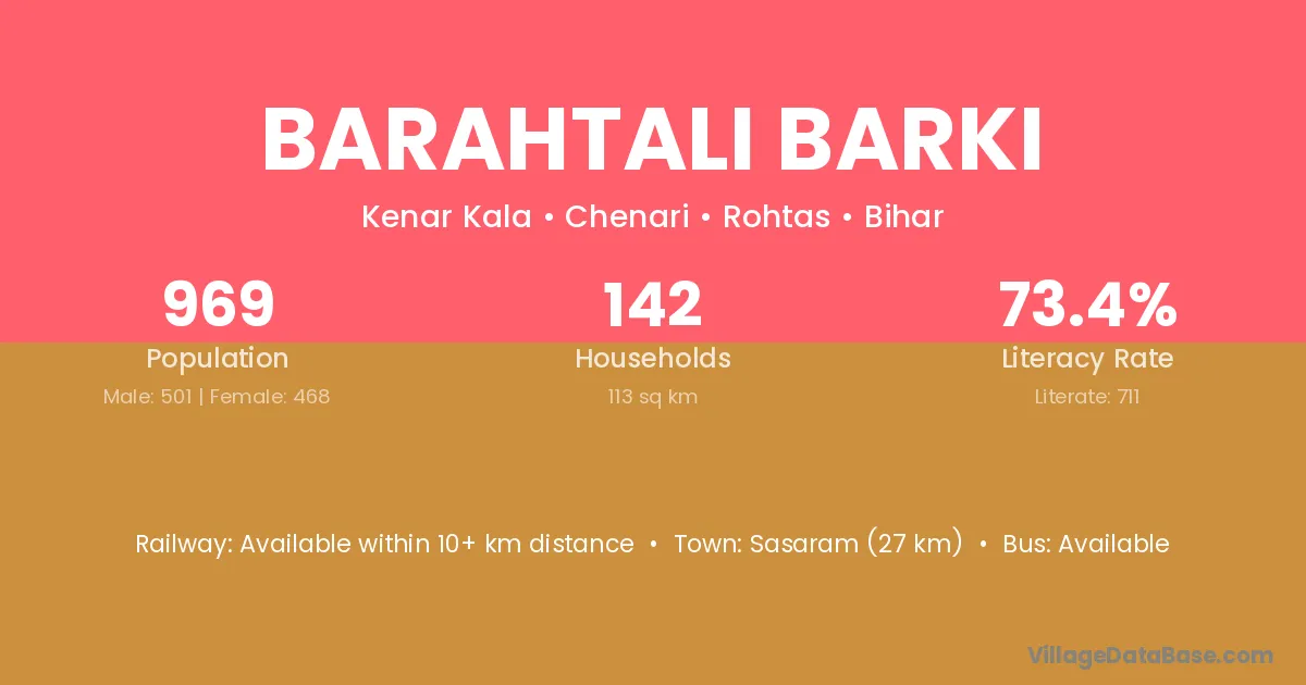Sasaram (27 km) is the nearest town to Barahtali Barki village for major economic activities and is located approximately 27 km away.