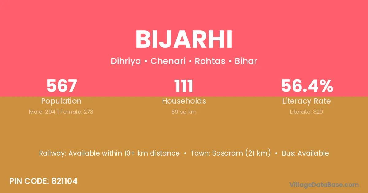 Sasaram (21 km) is the nearest town to Bijarhi village for major economic activities and is located approximately 21 km away.