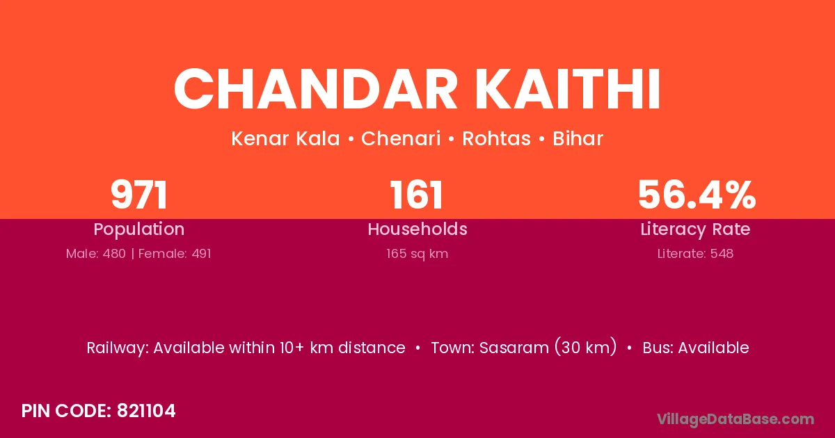 Sasaram (30 km) is the nearest town to Chandar Kaithi village for major economic activities and is located approximately 30 km away.