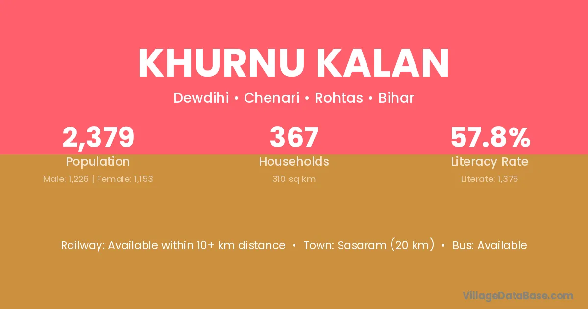 Sasaram (20 km) is the nearest town to Khurnu Kalan village for major economic activities and is located approximately 20 km away.