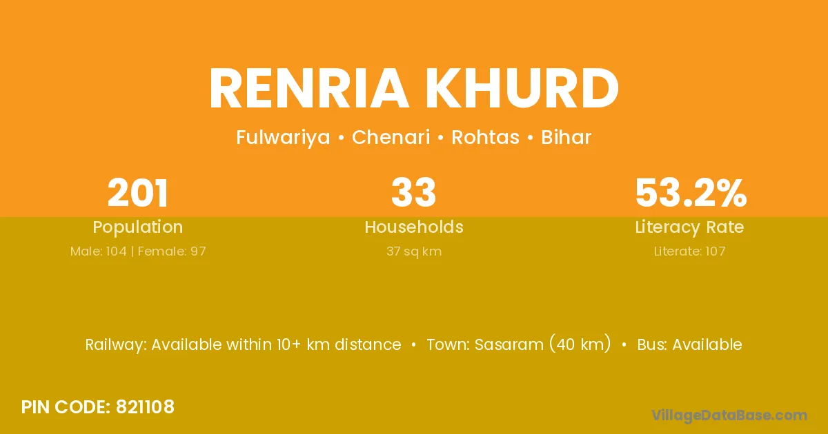 Sasaram (40 km) is the nearest town to Renria Khurd village for major economic activities and is located approximately 40 km away.