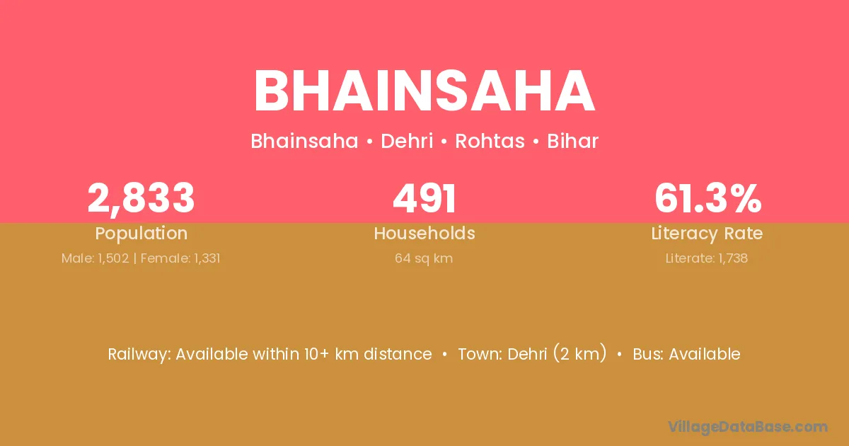 Dehri (2 km) is the nearest town to Bhainsaha village for major economic activities and is located approximately 2 km away.