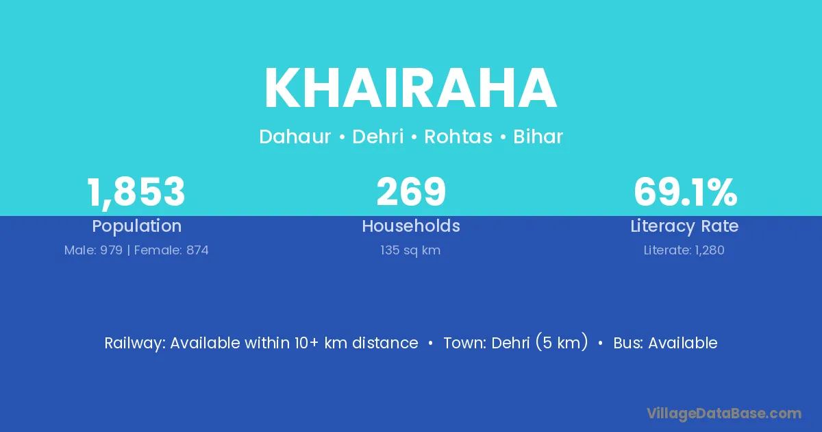 Dehri (5 km) is the nearest town to Khairaha village for major economic activities and is located approximately 5 km away.