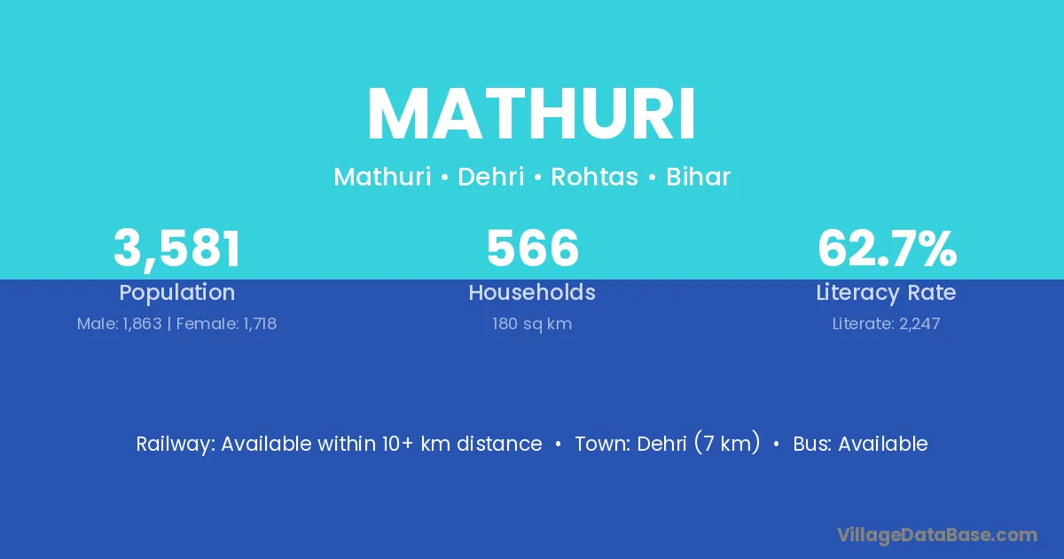 Dehri (7 km) is the nearest town to Mathuri village for major economic activities and is located approximately 7 km away.