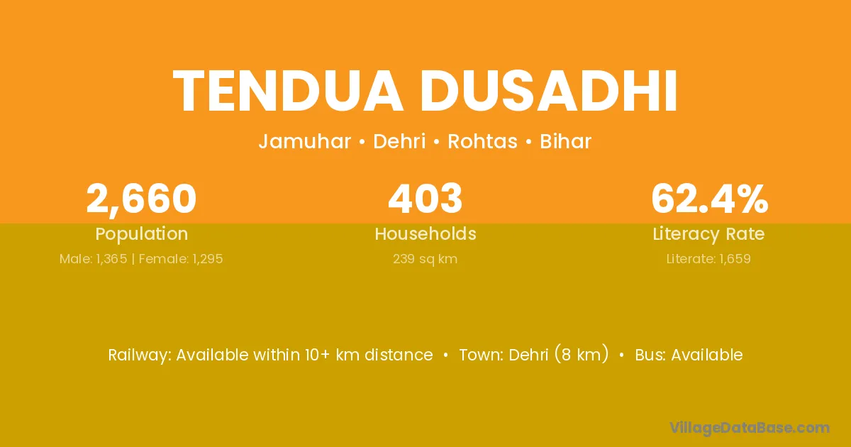 Dehri (8 km) is the nearest town to Tendua Dusadhi village for major economic activities and is located approximately 8 km away.