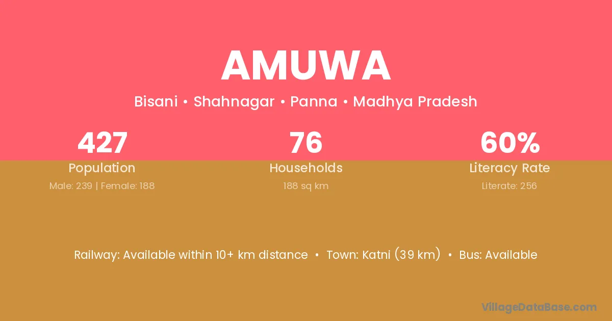 Amuwa village has a total population of 505 people, of which 252 are males and 253 are females.