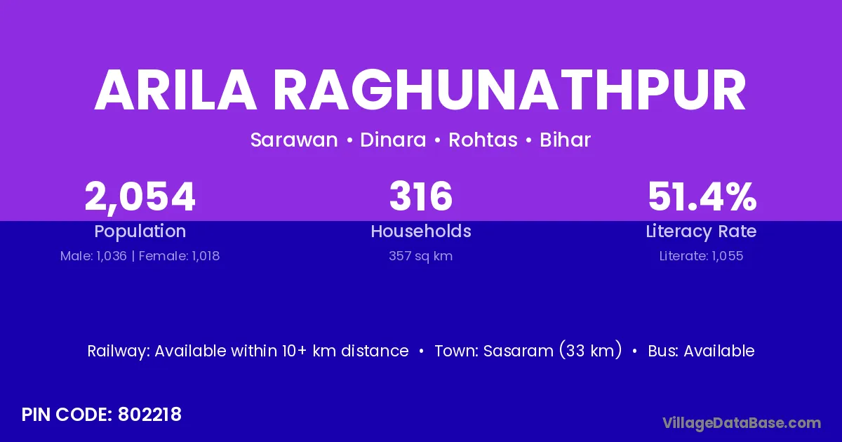 Sasaram (33 km) is the nearest town to Arila Raghunathpur village for major economic activities and is located approximately 33 km away.