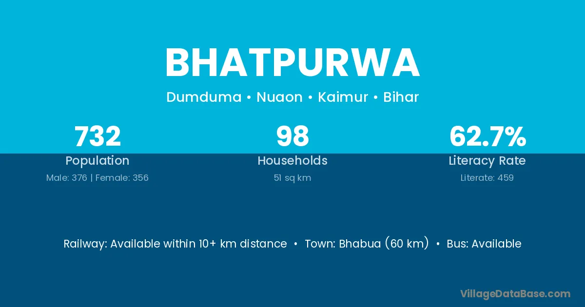Sasaram (35 km) is the nearest town to Bhatpurwa village for major economic activities and is located approximately 35 km away.