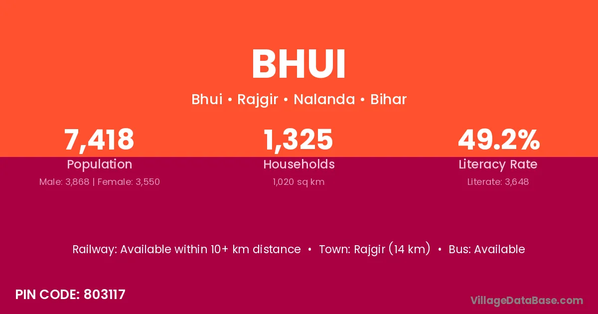 Sasaram (40 km) is the nearest town to Bhui village for major economic activities and is located approximately 40 km away.