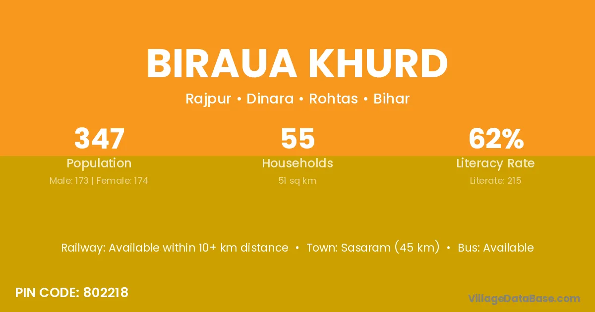 Sasaram (45 km) is the nearest town to Biraua Khurd village for major economic activities and is located approximately 45 km away.