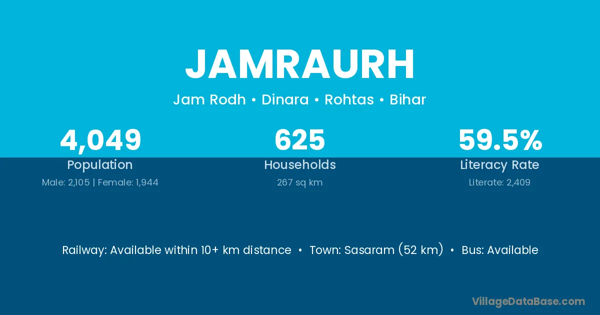 Sasaram (52 km) is the nearest town to Jamraurh village for major economic activities and is located approximately 52 km away.