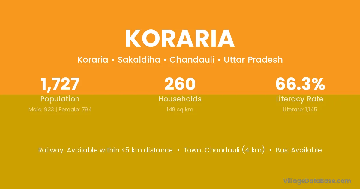 Sasaram (64 km) is the nearest town to Koraria village for major economic activities and is located approximately 64 km away.