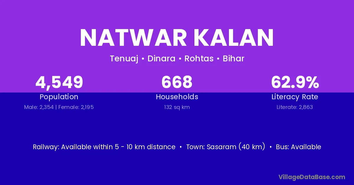 Sasaram (40 km) is the nearest town to Natwar Kalan village for major economic activities and is located approximately 40 km away.