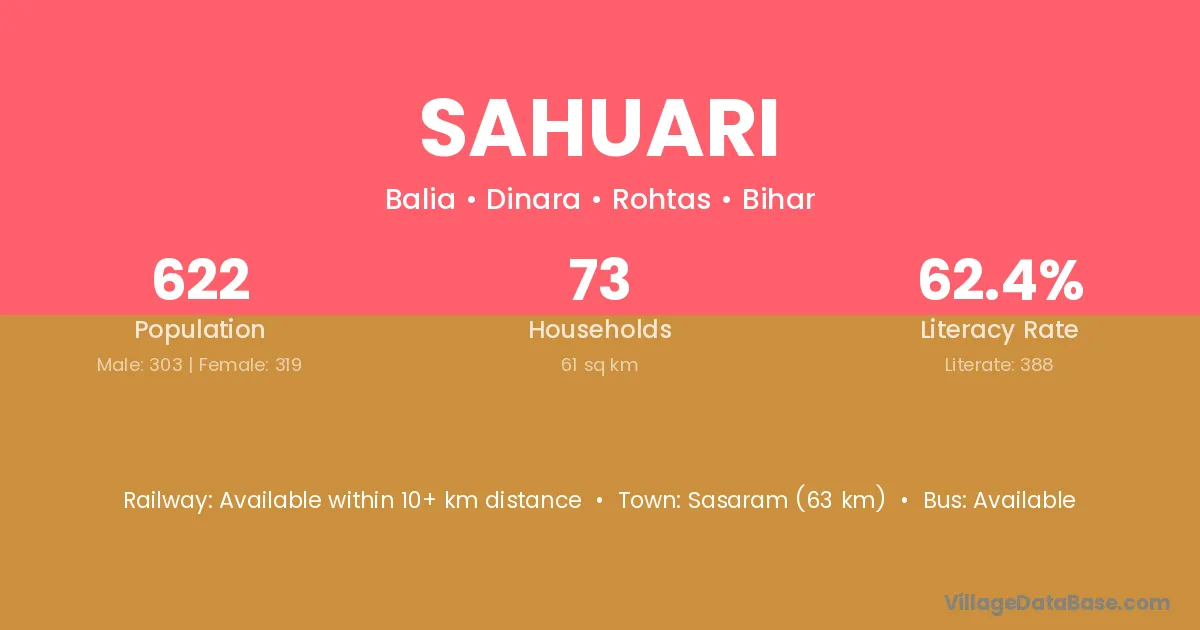 Sasaram (63 km) is the nearest town to Sahuari village for major economic activities and is located approximately 63 km away.