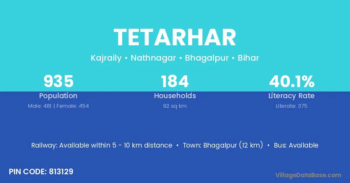 Sasaram (75 km) is the nearest town to Tetarhar village for major economic activities and is located approximately 75 km away.