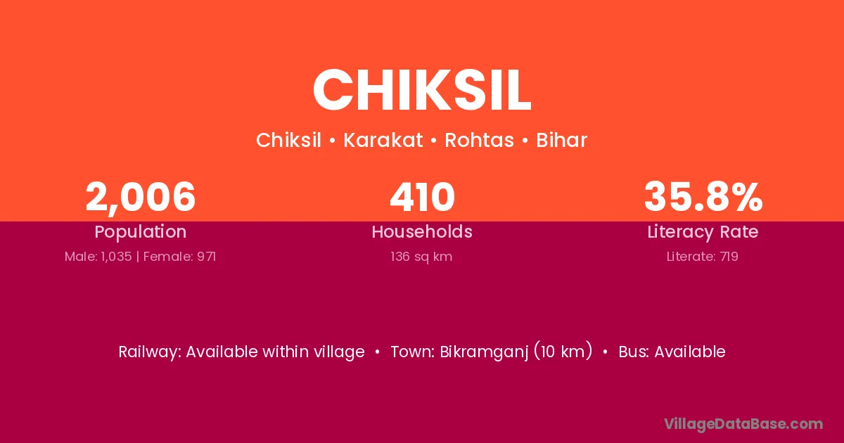 Bikramganj (10 km) is the nearest town to Chiksil village for major economic activities and is located approximately 10 km away.