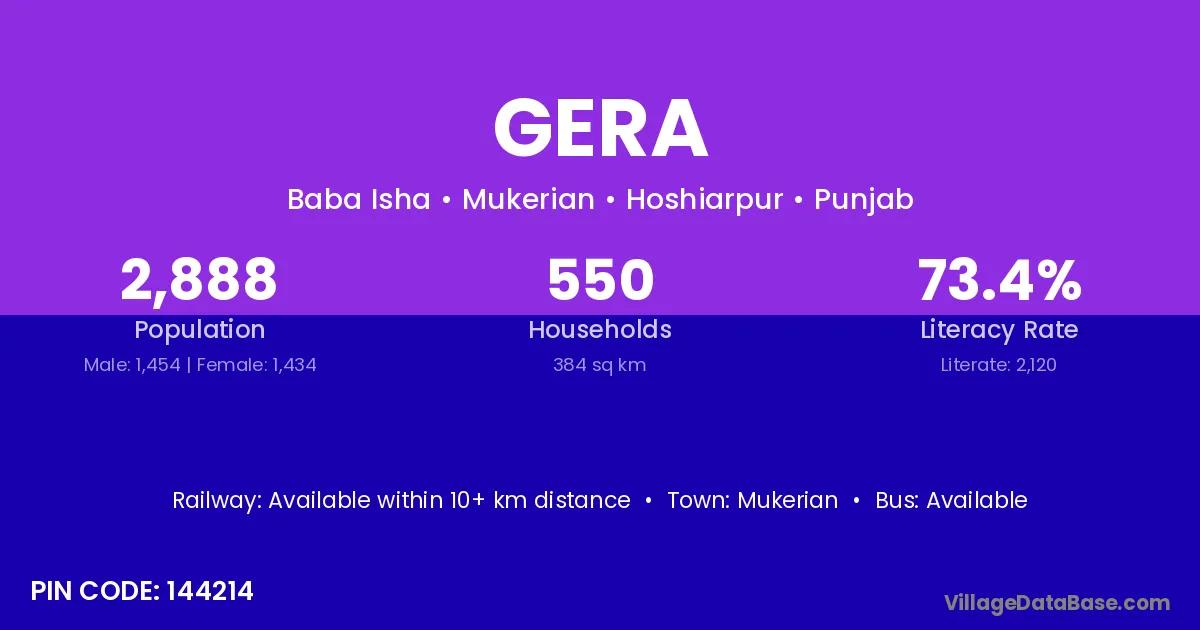 The literacy rate of Gera village is 68.39%. Male literacy stands at 76.44% and female literacy at 60.20%.