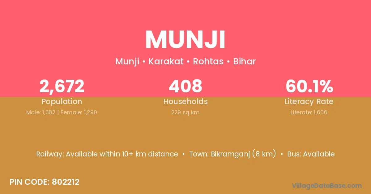 Bikramganj (8 km) is the nearest town to Munji village for major economic activities and is located approximately 8 km away.
