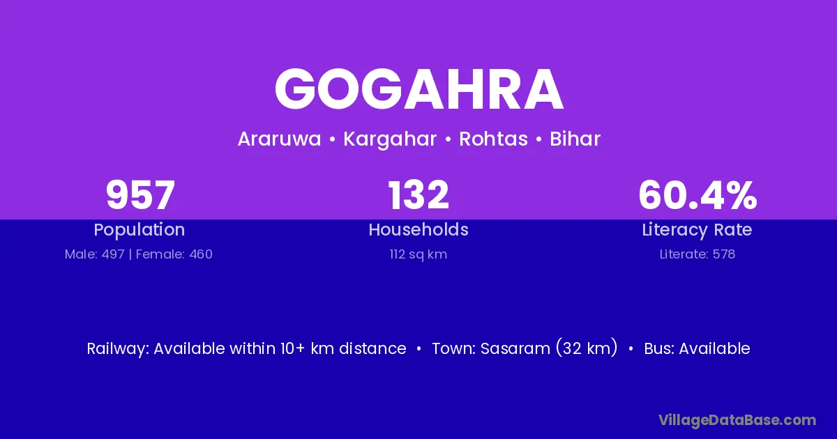 Sasaram (32 km) is the nearest town to Gogahra village for major economic activities and is located approximately 32 km away.