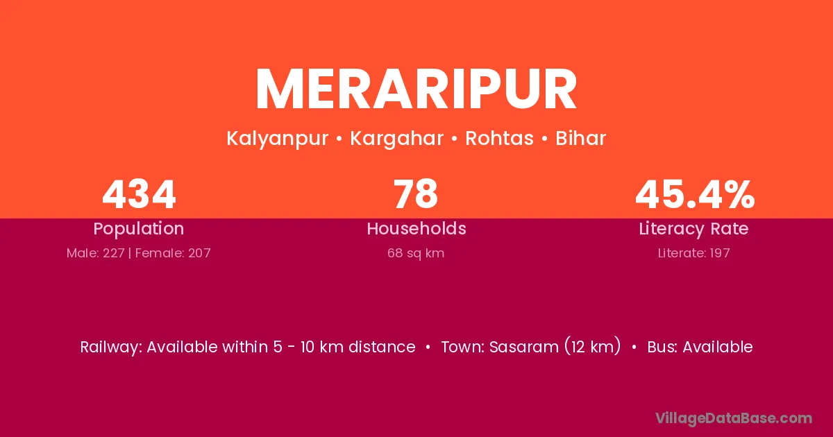 Sasaram (12 km) is the nearest town to Meraripur village for major economic activities and is located approximately 12 km away.