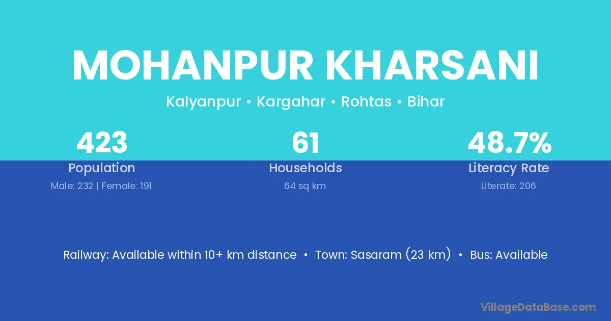 Sasaram (23 km) is the nearest town to Mohanpur Kharsani village for major economic activities and is located approximately 23 km away.