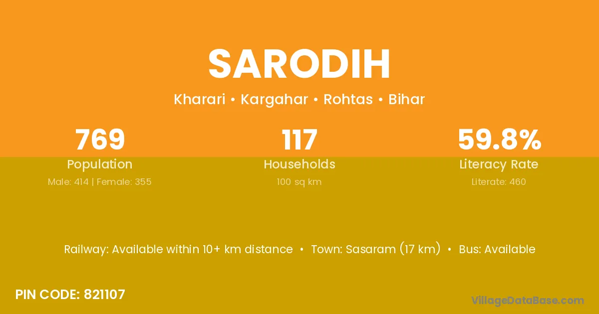 Sasaram (17 km) is the nearest town to Sarodih village for major economic activities and is located approximately 17 km away.