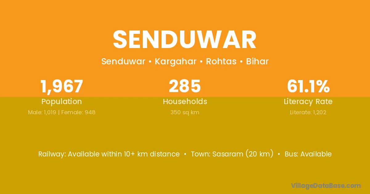 Sasaram (20 km) is the nearest town to Senduwar village for major economic activities and is located approximately 20 km away.