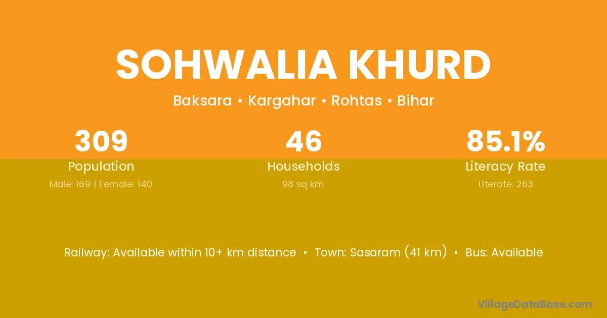 Sasaram (41 km) is the nearest town to Sohwalia Khurd village for major economic activities and is located approximately 41 km away.