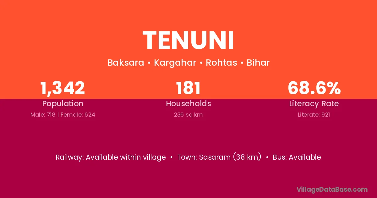 Sasaram (38 km) is the nearest town to Tenuni village for major economic activities and is located approximately 38 km away.