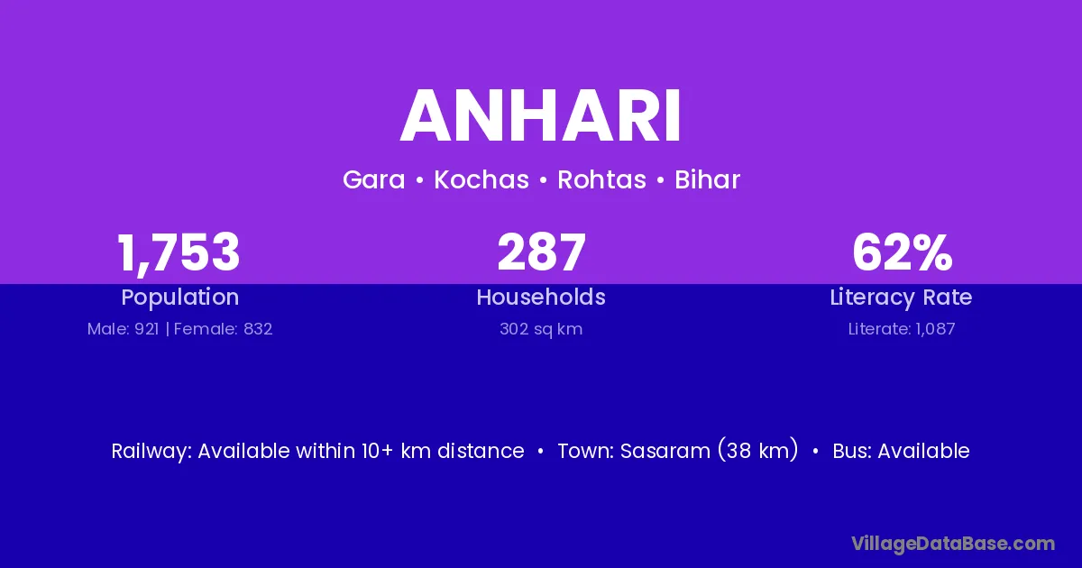 Sasaram (38 km) is the nearest town to Anhari village for major economic activities and is located approximately 38 km away.
