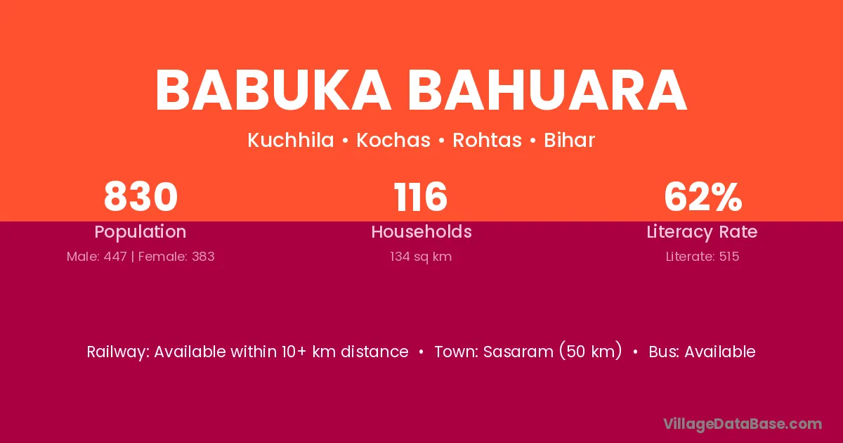 Sasaram (50 km) is the nearest town to Babuka Bahuara village for major economic activities and is located approximately 50 km away.