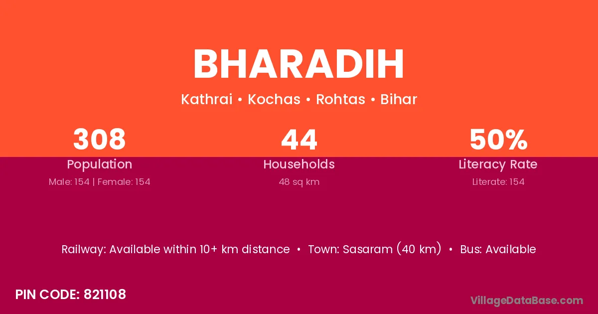 Sasaram (40 km) is the nearest town to Bharadih village for major economic activities and is located approximately 40 km away.