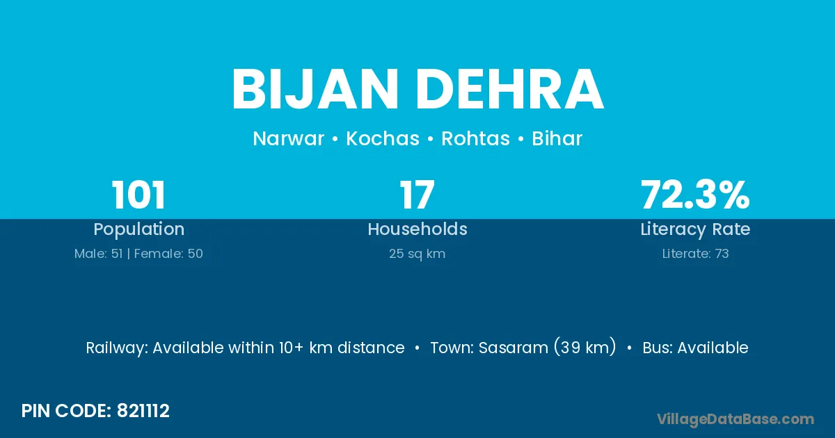 Sasaram (39 km) is the nearest town to Bijan Dehra village for major economic activities and is located approximately 39 km away.