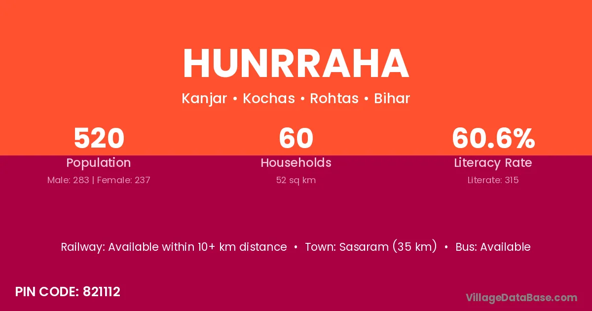Sasaram (35 km) is the nearest town to Hunrraha village for major economic activities and is located approximately 35 km away.