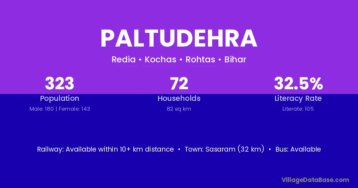 Sasaram (32 km) is the nearest town to Paltudehra village for major economic activities and is located approximately 32 km away.